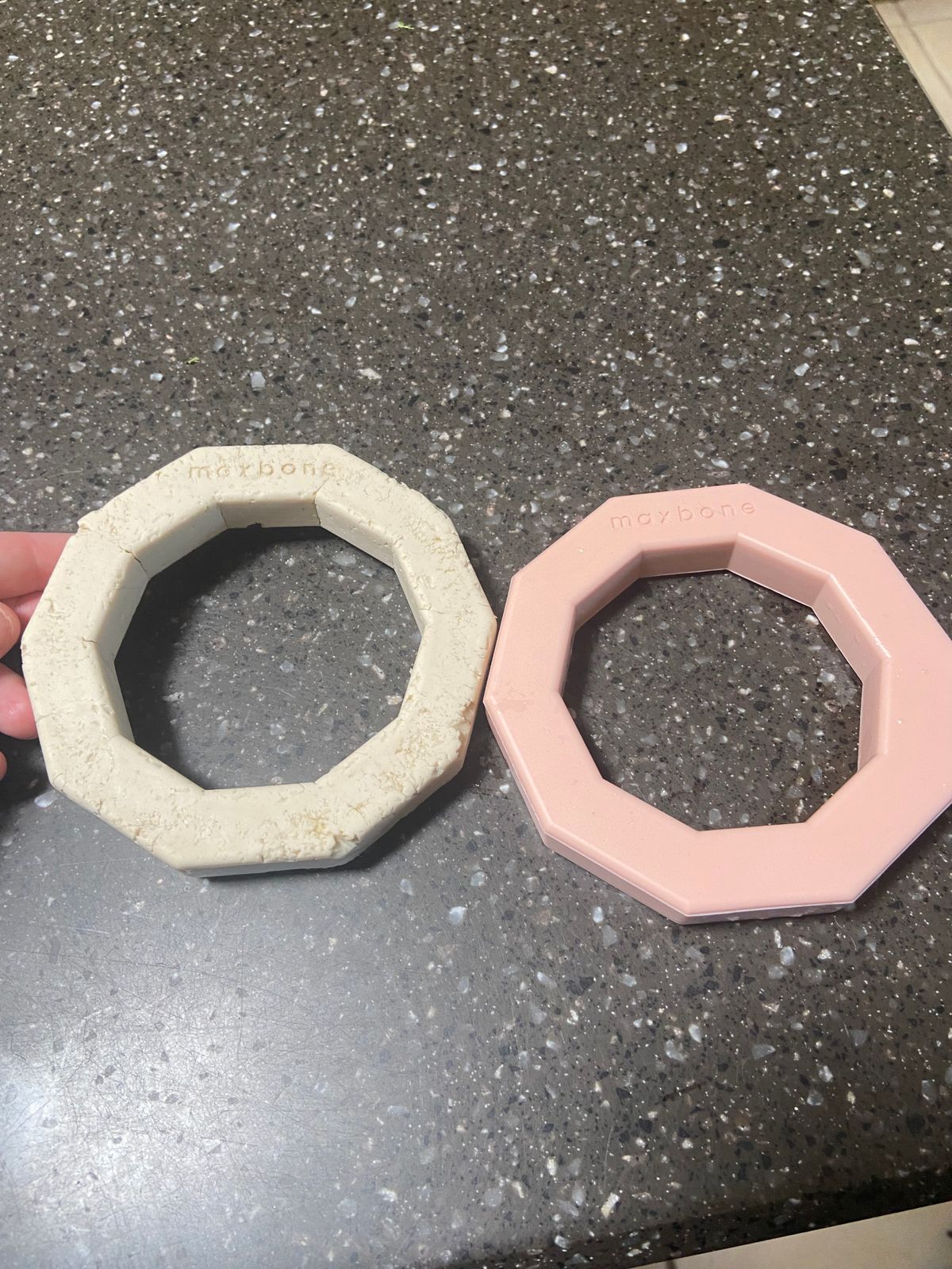 The one on the left we’ve had for two years. Our Rottweiler loves it and it’s survived her teeth and the summer sun down here in the southwest US. It’s still in one piece, just some cracks, but we’ve finally caved and got a new one so we can replace the cracked old one. Nothing bad to say about this toy, dog still loves it!