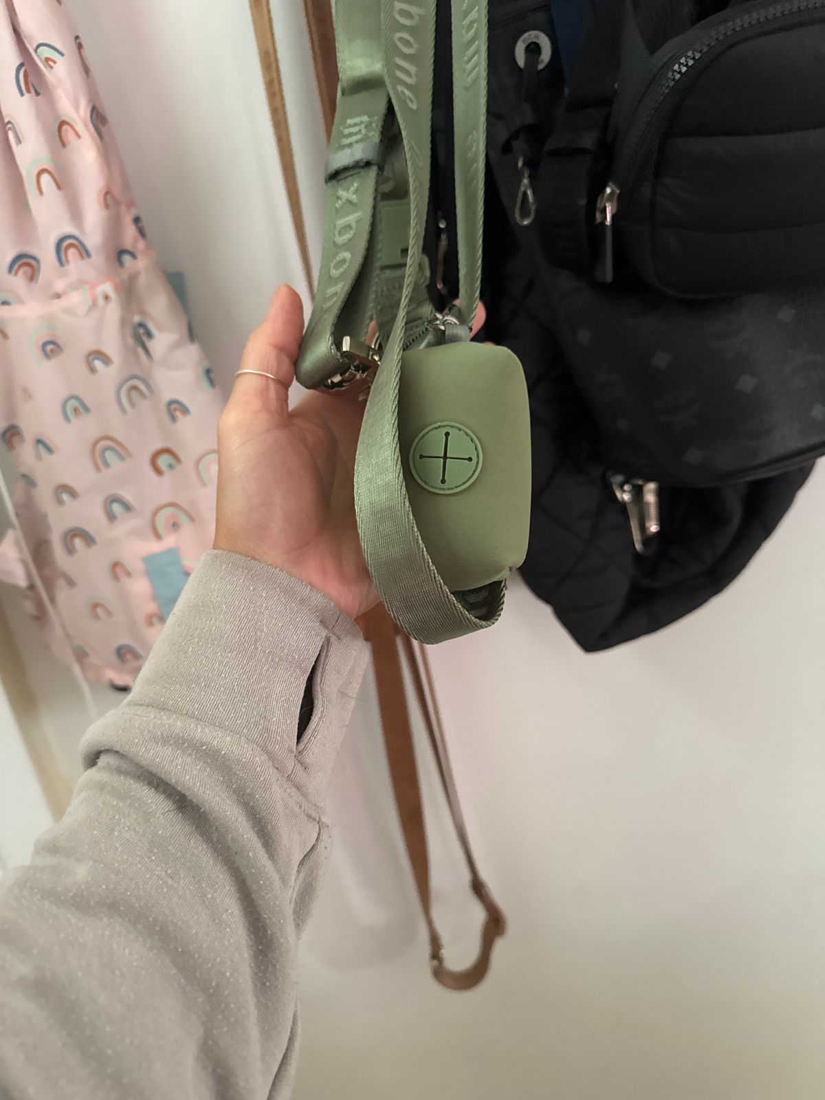 We have five French bulldogs and they each have their own set of a harness, hands-free leash and of course matching waste bag holder! Our youngest, Mabel, is almost a year old so it was finally time for her big girl set 🖤 this sage green is gorgeous and matches with our other camel and black sets!