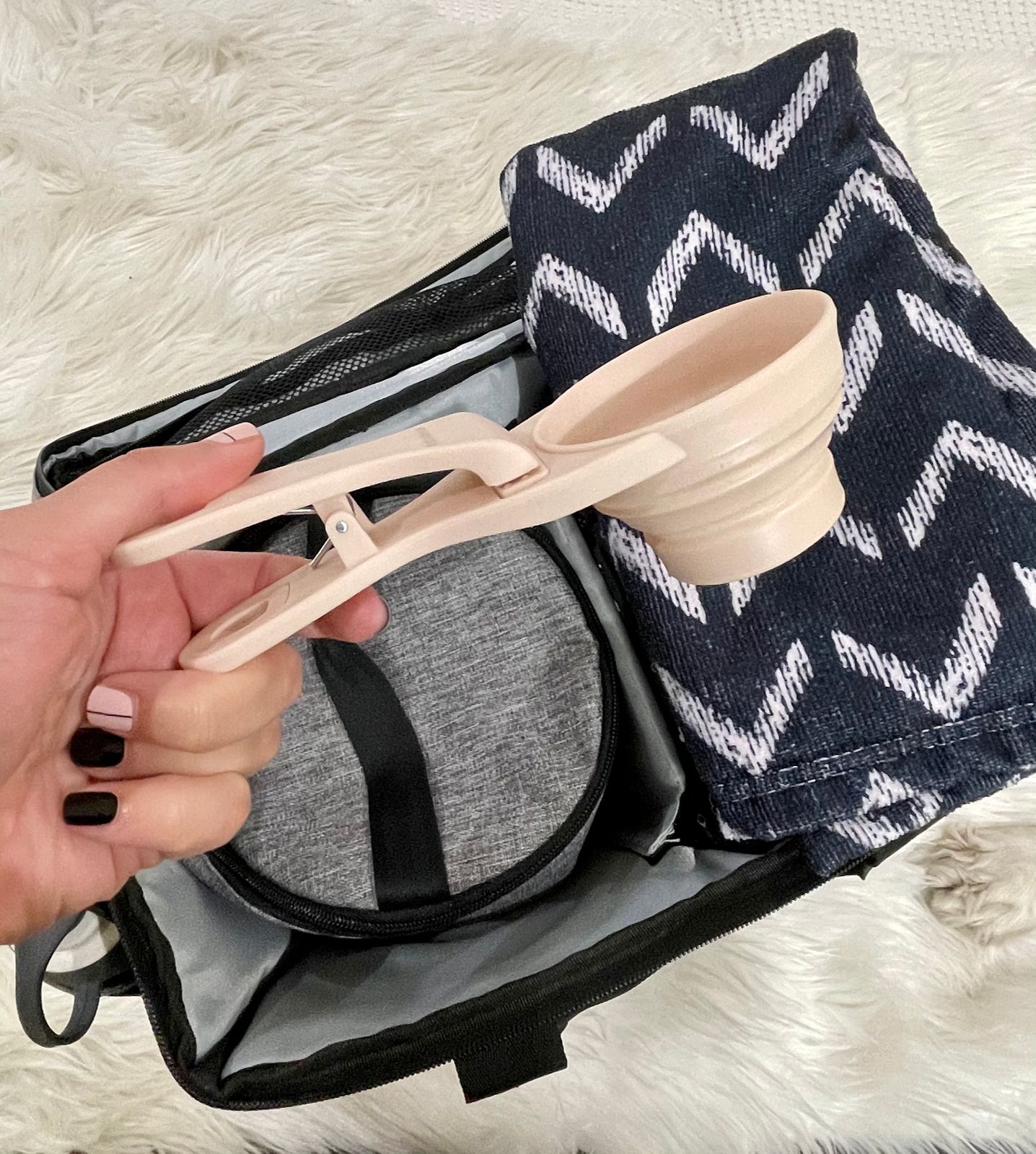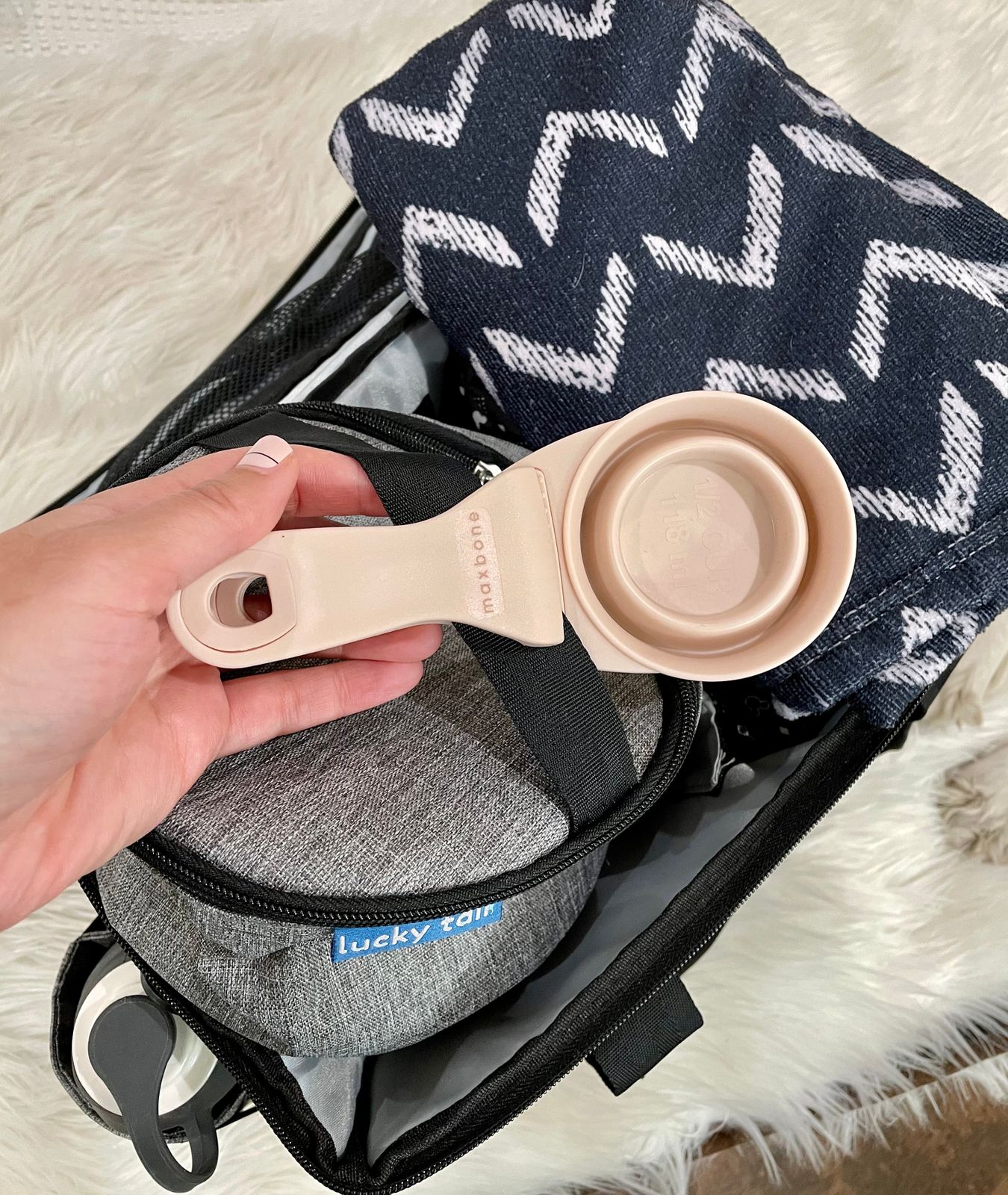 For some reason I latched onto this color. Maybe because it goes nicely with her bowls and my general aesthetic of neutrals. It's a 1/2 cup measurement [in case you had trouble locating that on the site like I did]. So it's perfect for us and super sturdy. I don't use it to keep bags closed, but to keep the scoop with the bag [without having to dig it out of the food inside]. It stays put for my needs